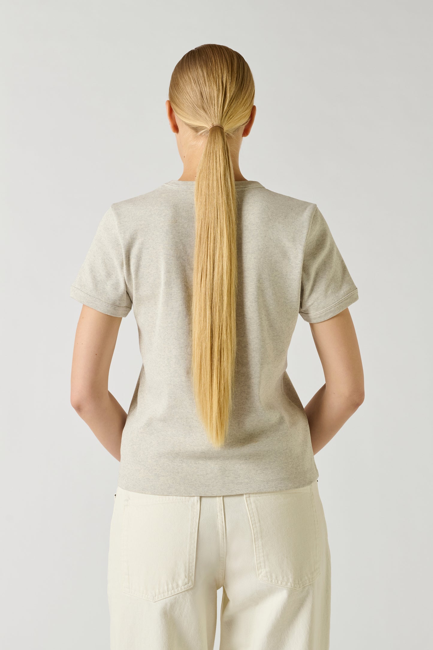 ARISTIDE es una camiseta de algodón orgánico tejida en canalé extrafino. Las costillas gruesas destacan el cuello y las mangas cortas y redondeadas, y refuerzan su pequeño formato ajustado al cuerpo. Nuestro logo "Soeur" está bordado en el centro del frente con un hilo tono sobre tono.